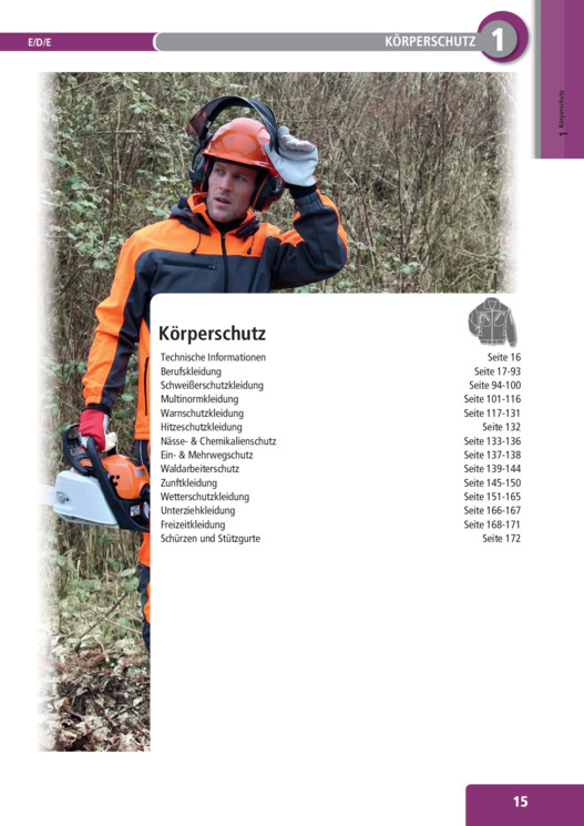 INHALT: 1E/D/E KÖRPERSCHUTZ Körperschutz1 Körperschutz Technische Informationen Berufskleidung Schweißerschutzkleidung Multinormkleidung Warnschutzkleidung Hitzeschutzkleidung Nässe- & Chemikalienschutz Ein- & Mehrwegschutz Waldarbeiterschutz Zunftkleidung Wetterschutzkleidung Unterziehkleidung Freizeitkleidung Schürzen und Stützgurte Seite 16 Seite 17-93 Seite 94-100 Seite 101-116 Seite 117-131 Seite 132 Seite 133-136 Seite 137-138 Seite 139-144 Seite 145-150 Seite 151-165 Seite 166-167 Seite 168-171 Seite 172 15