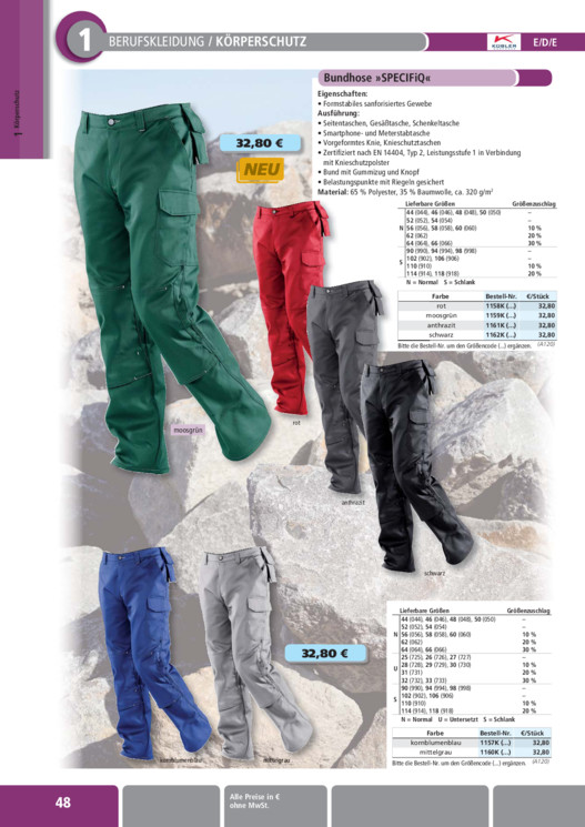 INHALT: Körperschutz1 1 BERUFSKLEIDUNG / KÖRPERSCHUTZ E/D/E 32,80 Bundhose »SPECIFiQ« Eigenschaften: · Formstabiles sanforisiertes Gewebe Ausführung: · Seitentaschen, Gesäßtasche, Schenkeltasche · Smartphone- und Meterstabtasche · Vorgeformtes Knie, Knieschutztaschen · Zertifiziert nach EN 14404, Typ 2, Leistungsstufe 1 in Verbindung mit Knieschutzpolster · Bund mit Gummizug und Knopf · Belastungspunkte mit Riegeln gesichert Material: 65 % Polyester, 35 % Baumwolle, ca. 320 g/m2 Lieferbare Größen 44 (044), 46 (046), 48 (048), 50 (050) 52 (052), 54 (054) N 56 (056), 58 (058), 60 (060) 62 (062) 64 (064), 66 (066) 90 (990), 94 (994), 98 (998) S 102 (902), 106 (906) 110 (910) 114 (914), 118 (918) N = Normal S = Schlank Größenzuschlag 10 % 20 % 30 % 10 % 20 % Farbe Bestell-Nr. /Stück rot 1158K (...) 32,80 moosgrün 1159K (...) 32,80 anthrazit 1161K (...) 32,80 schwarz 1162K (...) 32,80 Bitte die Bestell-Nr. um den Größencode (...) ergänzen. (A120) 48 moosgrün rot anthrazit 32,80 kornblumenblau mittelgrau Alle Preise in ohne MwSt. schwarz Lieferbare Größen Größenzuschlag 44 (044), 46 (046), 48 (048), 50 (050) 52 (052), 54 (054) N 56 (056), 58 (058), 60 (060) 10 % 62 (062) 20 % 64 (064), 66 (066) 30 % 25 (725), 26 (726), 27 (727) U 28 (728), 29 (729), 30 (730) 31 (731) 10 % 20 % 32 (732), 33 (733) 30 % 90 (990), 94 (994), 98 (998) S 102 (902), 106 (906) 110 (910) 10 % 114 (914), 118 (918) 20 % N = Normal U = Untersetzt S = Schlank Farbe Bestell-Nr. /Stück kornblumenblau 1157K (...) 32,80 mittelgrau 1160K (...) 32,80 Bitte die Bestell-Nr. um den Größencode (...) ergänzen. (A120)