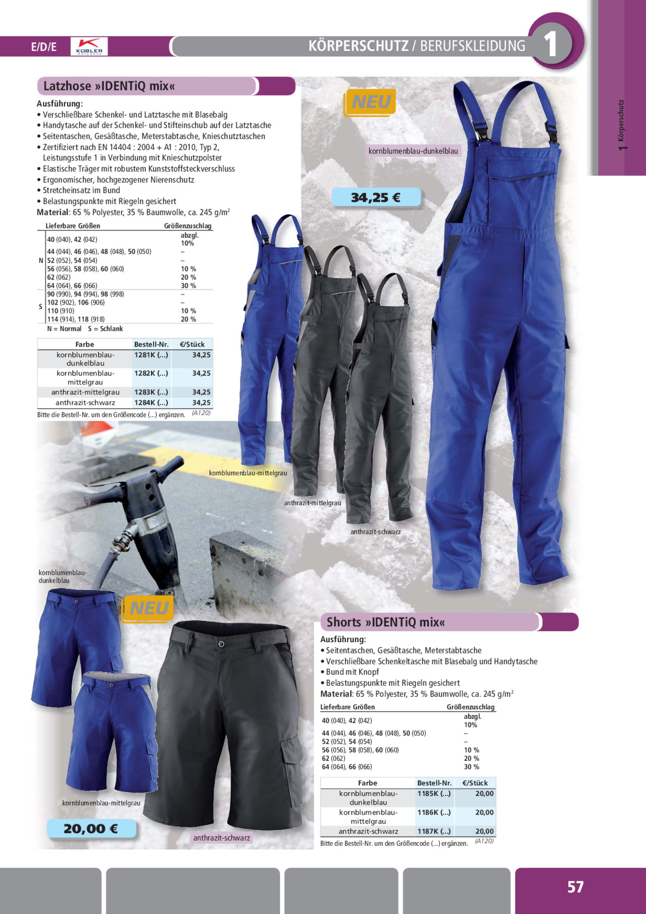 INHALT: Körperschutz1 E/D/E Latzhose »IDENTiQ mix« Ausführung: · Verschließbare Schenkel- und Latztasche mit Blasebalg · Handytasche auf der Schenkel- und Stifteinschub auf der Latztasche · Seitentaschen, Gesäßtasche, Meterstabtasche, Knieschutztaschen · Zertifiziert nach EN 14404 : 2004 + A1 : 2010, Typ 2, Leistungsstufe 1 in Verbindung mit Knieschutzpolster · Elastische Träger mit robustem Kunststoffsteckverschluss · Ergonomischer, hochgezogener Nierenschutz · Stretcheinsatz im Bund · Belastungspunkte mit Riegeln gesichert Material: 65 % Polyester, 35 % Baumwolle, ca. 245 g/m2 Lieferbare Größen 40 (040), 42 (042) 44 (044), 46 (046), 48 (048), 50 (050) N 52 (052), 54 (054) 56 (056), 58 (058), 60 (060) 62 (062) 64 (064), 66 (066) 90 (990), 94 (994), 98 (998) S 102 (902), 106 (906) 110 (910) 114 (914), 118 (918) N = Normal S = Schlank Größenzuschlag abzgl. 10% 10 % 20 % 30 % 10 % 20 % Farbe Bestell-Nr. /Stück kornblumenblaudunkelblau 1281K (...) 34,25 kornblumenblaumittelgrau 1282K (...) 34,25 anthrazit-mittelgrau 1283K (...) 34,25 anthrazit-schwarz 1284K (...) 34,25 Bitte die Bestell-Nr. um den Größencode (...) ergänzen. (A120) 1KÖRPERSCHUTZ / BERUFSKLEIDUNG kornblumenblau-dunkelblau 34,25 kornblumenblaudunkelblau kornblumenblau-mittelgrau 20,00 kornbl kornblumenblau-mittelgrau anthrazit-mittelgrau anthrazit-schwarz anthrazit-schwarz Shorts »IDENTiQ mix« Ausführung: · Seitentaschen, Gesäßtasche, Meterstabtasche · Verschließbare Schenkeltasche mit Blasebalg und Handytasche · Bund mit Knopf · Belastungspunkte mit Riegeln gesichert Material: 65 % Polyester, 35 % Baumwolle, ca. 245 g/m2 Lieferbare Größen 40 (040), 42 (042) 44 (044), 46 (046), 48 (048), 50 (050) 52 (052), 54 (054) 56 (056), 58 (058), 60 (060) 62 (062) 64 (064), 66 (066) Größenzuschlag abzgl. 10% 10 % 20 % 30 % Farbe Bestell-Nr. /Stück kornblumenblaudunkelblau 1185K (...) 20,00 kornblumenblaumittelgrau 1186K (...) 20,00 anthrazit-schwarz 1187K (...) 20,00 Bitte die Bestell-Nr. um den Größencode (...) ergänzen. (A120) 57