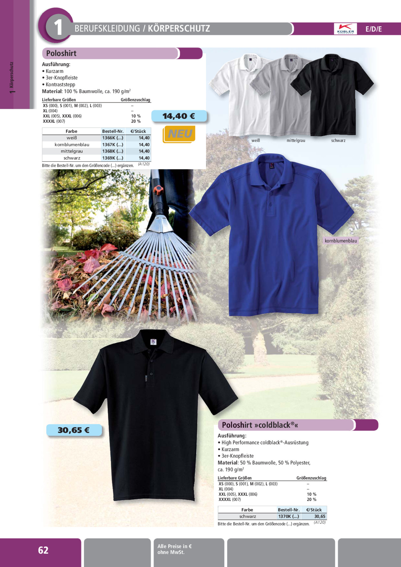 INHALT: Körperschutz1 1 BERUFSKLEIDUNG / KÖRPERSCHUTZ Poloshirt Ausführung: · Kurzarm · 3er-Knopfleiste · Kontraststepp Material: 100 % Baumwolle, ca. 190 g/m2 Lieferbare Größen XS (000), S (001), M (002), L (003) XL (004) XXL (005), XXXL (006) XXXXL (007) Größenzuschlag 10 % 20 % Farbe Bestell-Nr. /Stück weiß 1366K (...) 14,40 kornblumenblau 1367K (...) 14,40 mittelgrau 1368K (...) 14,40 schwarz 1369K (...) 14,40 Bitte die Bestell-Nr. um den Größencode (...) ergänzen. (A120) 14,40 E/D/E weiß mittelgrau schwarz kornblumenblau 30,65 62 Alle Preise in ohne MwSt. Poloshirt »coldblack®« Ausführung: · High Performance coldblack®-Ausrüstung · Kurzarm · 3er-Knopfleiste Material: 50 % Baumwolle, 50 % Polyester, ca. 190 g/m2 Lieferbare Größen XS (000), S (001), M (002), L (003) XL (004) XXL (005), XXXL (006) XXXXL (007) Größenzuschlag 10 % 20 % Farbe Bestell-Nr. /Stück schwarz 1370K (...) 30,65 Bitte die Bestell-Nr. um den Größencode (...) ergänzen. (A120)