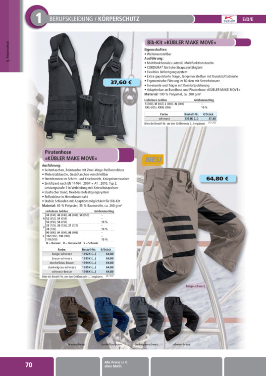 INHALT: Körperschutz1 1 BERUFSKLEIDUNG / KÖRPERSCHUTZ E/D/E 37,60 Bib-Kit »KÜBLER MAKE MOVE« Eigenschaften: · Weitenverstellbar Ausführung: · Multifunktionales Latzteil, Multifunktionstasche · CORDURA® für hohe Strapazierfähigkeit · Flexibles Befestigungssystem · Extra gepolsterte Träger, längenverstellbar mit Kunststoffschnalle · Ergonomische Führung im Rücken mit Stretcheinsatz · Innenseite und Träger mit Komfortpolsterung · Adaptierbar an Bundhose und Piratenhose »KÜBLER MAKE MOVE« Material: 100 % Polyamid, ca. 200 g/m2 Lieferbare Größen S (000), M (002), L (003), XL (004) XXL (005), XXXL (006) Größenzuschlag 10 % Farbe Bestell-Nr. /Stück schwarz 1353K (...) 37,60 Bitte die Bestell-Nr. um den Größencode (...) ergänzen. (A120) Piratenhose »KÜBLER MAKE MOVE« Ausführung: · Seitentaschen, Beintasche mit Zwei-Wege-Reißverschluss · Meterstabtasche, Gesäßtaschen verschließbar · Stretchzonen im Schritt- und Kniebereich, Kniepolstertaschen · Zertifiziert nach EN 14404 : 2004 + A1 : 2010, Typ 2, Leistungsstufe 1 in Verbindung mit Knieschutzpolster · Elastischer Bund, flexibles Befestigungssystem · Reflexbiese in Hinterhosennaht · Stabile Schlaufen mit Adaptionsmöglichkeit für Bib-Kit Material: 65 % Polyester, 35 % Baumwolle, ca. 260 g/m2 Lieferbare Größen Größenzuschlag 44 (044), 46 (046), 48 (048), 50 (050) N 52 (052), 54 (054) 56 (056), 58 (058) U 25 (725), 26 (726), 27 (727) 28 (728) 90 (990), 94 (994), 98 (998) S 102 (902), 106 (906) 110 (910) 10 % 10 % 10 % N = Normal U = Untersetzt S = Schlank Farbe Bestell-Nr. /Stück beige-schwarz 1392K (...) 64,80 braun-schwarz 1393K (...) 64,80 dunkelblau-braun 1394K (...) 64,80 dunkelgrau-schwarz 1395K (...) 64,80 schwarz-braun 1396K (...) 64,80 Bitte die Bestell-Nr. um den Größencode (...) ergänzen. (A120) 64,80 beige-schwarz 70 braun-schwarz dunkelblau-braun dunkelgrau-schwarz schwarz-braun Alle Preise in ohne MwSt.