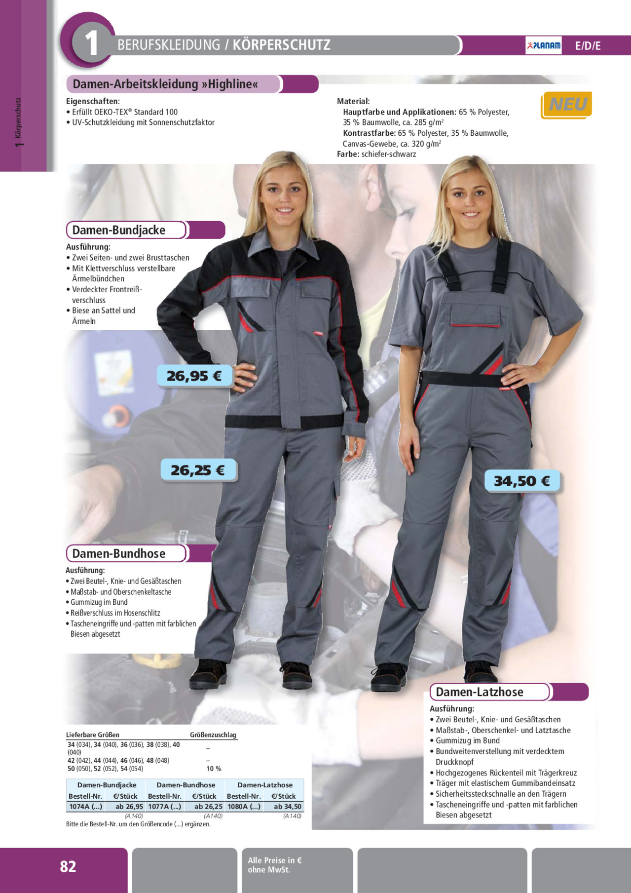 INHALT: Körperschutz1 1 BERUFSKLEIDUNG / KÖRPERSCHUTZ Damen-Arbeitskleidung »Highline« Eigenschaften: · Erfüllt OEKO-TEX® Standard 100 · UV-Schutzkleidung mit Sonnenschutzfaktor Material: Hauptfarbe und Applikationen: 65 % Polyester, 35 % Baumwolle, ca. 285 g/m2 Kontrastfarbe: 65 % Polyester, 35 % Baumwolle, Canvas-Gewebe, ca. 320 g/m2 Farbe: schiefer-schwarz E/D/E Damen-Bundjacke Ausführung: · Zwei Seiten- und zwei Brusttaschen · Mit Klettverschluss verstellbare Ärmelbündchen · Verdeckter Frontreiß- verschluss · Biese an Sattel und Ärmeln a2b 626,9,955 a2b 626,2,255 Damen-Bundhose Ausführung: · Zwei Beutel-, Knie- und Gesäßtaschen · Maßstab- und Oberschenkeltasche · Gummizug im Bund · Reißverschluss im Hosenschlitz · Tascheneingriffe und -patten mit farblichen Biesen abgesetzt Lieferbare Größen 34 (034), 34 (040), 36 (036), 38 (038), 40 (040) 42 (042), 44 (044), 46 (046), 48 (048) 50 (050), 52 (052), 54 (054) Größenzuschlag 10 % Damen-Bundjacke Damen-Bundhose Damen-Latzhose Bestell-Nr. /Stück Bestell-Nr. /Stück Bestell-Nr. /Stück 1074A (...) ab 26,95 1077A (...) ab 26,25 1080A (...) (A140) (A140) Bitte die Bestell-Nr. um den Größencode (...) ergänzen. ab 34,50 (A140) 82 Alle Preise in ohne MwSt. a3b 434,5,500 Damen-Latzhose Ausführung: · Zwei Beutel-, Knie- und Gesäßtaschen · Maßstab-, Oberschenkel- und Latztasche · Gummizug im Bund · Bundweitenverstellung mit verdecktem Druckknopf · Hochgezogenes Rückenteil mit Trägerkreuz · Träger mit elastischem Gummibandeinsatz · Sicherheitssteckschnalle an den Trägern · Tascheneingriffe und -patten mit farblichen Biesen abgesetzt