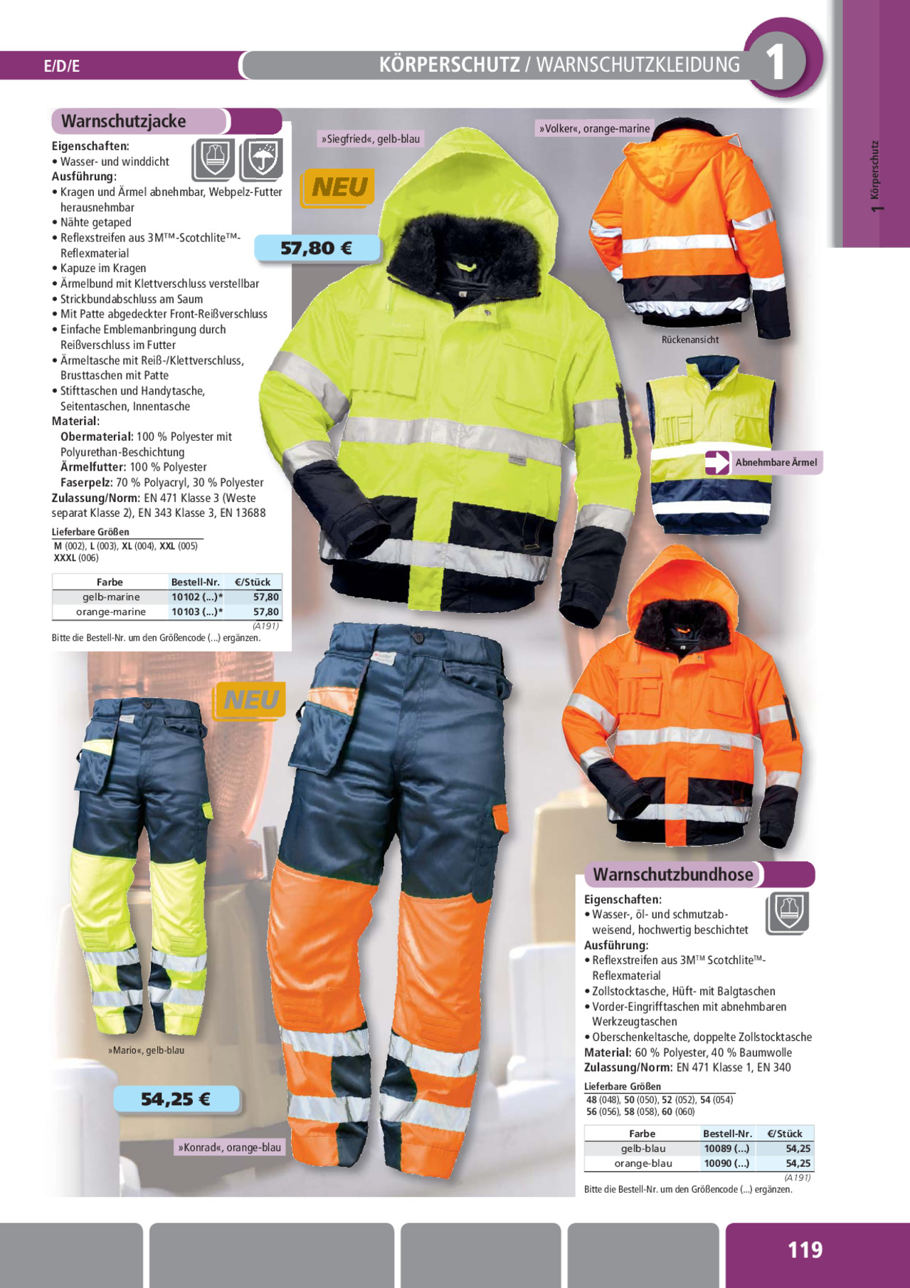 INHALT: Körperschutz1 1E/D/E KÖRPERSCHUTZ / WARNSCHUTZKLEIDUNG Warnschutzjacke Eigenschaften: »Siegfried«, gelb-blau · Wasser- und winddicht Ausführung: · Kragen und Ärmel abnehmbar, Webpelz-Futter herausnehmbar · Nähte getaped · Reflexstreifen aus 3MTM-ScotchliteTMReflexmaterial 57,80 · Kapuze im Kragen · Ärmelbund mit Klettverschluss verstellbar · Strickbundabschluss am Saum · Mit Patte abgedeckter Front-Reißverschluss · Einfache Emblemanbringung durch Reißverschluss im Futter · Ärmeltasche mit Reiß-/Klettverschluss, Brusttaschen mit Patte · Stifttaschen und Handytasche, Seitentaschen, Innentasche Material: Obermaterial: 100 % Polyester mit Polyurethan-Beschichtung Ärmelfutter: 100 % Polyester Faserpelz: 70 % Polyacryl, 30 % Polyester Zulassung/Norm: EN 471 Klasse 3 (Weste separat Klasse 2), EN 343 Klasse 3, EN 13688 Lieferbare Größen M (002), L (003), XL (004), XXL (005) XXXL (006) Farbe Bestell-Nr. /Stück gelb-marine 10102 (...)* 57,80 orange-marine 10103 (...)* 57,80 (A191) Bitte die Bestell-Nr. um den Größencode (...) ergänzen. »Volker«, orange-marine Rückenansicht Abnehmbare Ärmel »Mario«, gelb-blau 54,25 »Konrad«, orange-blau Warnschutzbundhose Eigenschaften: · Wasser-, öl- und schmutzab- weisend, hochwertig beschichtet Ausführung: · Reflexstreifen aus 3MTM ScotchliteTM- Reflexmaterial · Zollstocktasche, Hüft- mit Balgtaschen · Vorder-Eingrifftaschen mit abnehmbaren Werkzeugtaschen · Oberschenkeltasche, doppelte Zollstocktasche Material: 60 % Polyester, 40 % Baumwolle Zulassung/Norm: EN 471 Klasse 1, EN 340 Lieferbare Größen 48 (048), 50 (050), 52 (052), 54 (054) 56 (056), 58 (058), 60 (060) Farbe Bestell-Nr. /Stück gelb-blau 10089 (...) 54,25 orange-blau 10090 (...) 54,25 (A191) Bitte die Bestell-Nr. um den Größencode (...) ergänzen. 119
