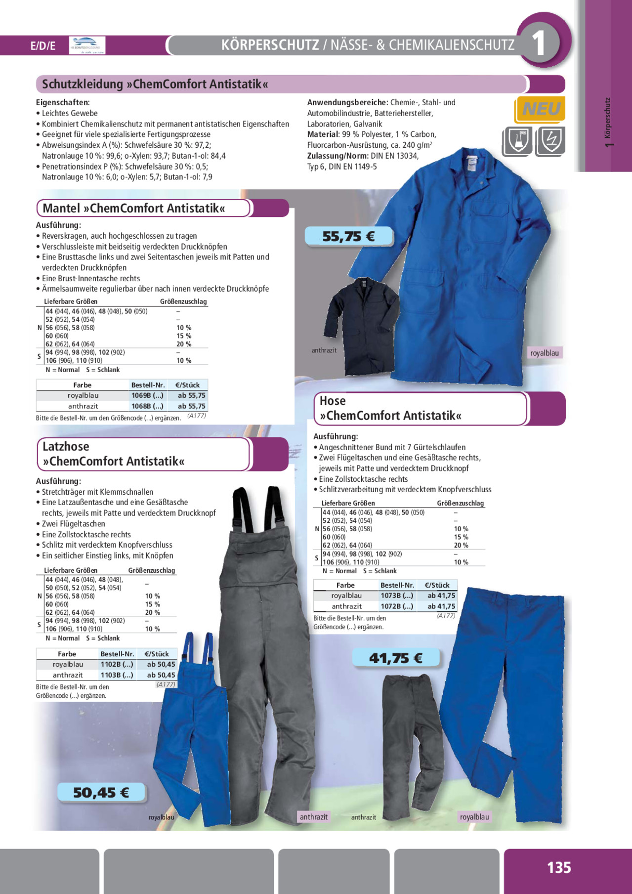 INHALT: Körperschutz1 1E/D/E KÖRPERSCHUTZ / NÄSSE- & CHEMIKALIENSCHUTZ Schutzkleidung »ChemComfort Antistatik« Eigenschaften: · Leichtes Gewebe · Kombiniert Chemikalienschutz mit permanent antistatischen Eigenschaften · Geeignet für viele spezialisierte Fertigungsprozesse · Abweisungsindex A (%): Schwefelsäure 30 %: 97,2; Natronlauge 10 %: 99,6; o-Xylen: 93,7; Butan-1-ol: 84,4 · Penetrationsindex P (%): Schwefelsäure 30 %: 0,5; Natronlauge 10 %: 6,0; o-Xylen: 5,7; Butan-1-ol: 7,9 Anwendungsbereiche: Chemie-, Stahl- und Automobilindustrie, Batteriehersteller, Laboratorien, Galvanik Material: 99 % Polyester, 1 % Carbon, Fluorcarbon-Ausrüstung, ca. 240 g/m2 Zulassung/Norm: DIN EN 13034, Typ 6, DIN EN 1149-5 Mantel »ChemComfort Antistatik« Ausführung: · Reverskragen, auch hochgeschlossen zu tragen · Verschlussleiste mit beidseitig verdeckten Druckknöpfen · Eine Brusttasche links und zwei Seitentaschen jeweils mit Patten und verdeckten Druckknöpfen · Eine Brust-Innentasche rechts · Ärmelsaumweite regulierbar über nach innen verdeckte Druckknöpfe Lieferbare Größen 44 (044), 46 (046), 48 (048), 50 (050) 52 (052), 54 (054) N 56 (056), 58 (058) 60 (060) 62 (062), 64 (064) S 94 (994), 98 (998), 102 (902) 106 (906), 110 (910) N = Normal S = Schlank Größenzuschlag 10 % 15 % 20 % 10 % Farbe Bestell-Nr. /Stück royalblau 1069B (...) ab 55,75 anthrazit 1068B (...) ab 55,75 Bitte die Bestell-Nr. um den Größencode (...) ergänzen. (A177) Latzhose »ChemComfort Antistatik« Ausführung: · Stretchträger mit Klemmschnallen · Eine Latzaußentasche und eine Gesäßtasche rechts, jeweils mit Patte und verdecktem Druckknopf · Zwei Flügeltaschen · Eine Zollstocktasche rechts · Schlitz mit verdecktem Knopfverschluss · Ein seitlicher Einstieg links, mit Knöpfen Lieferbare Größen Größenzuschlag 44 (044), 46 (046), 48 (048), 50 (050), 52 (052), 54 (054) N 56 (056), 58 (058) 10 % 60 (060) 15 % 62 (062), 64 (064) 20 % S 94 (994), 98 (998), 102 (902) 106 (906), 110 (910) 10 % N = Normal S = Schlank Farbe royalblau Bestell-Nr. 1102B (...) anthrazit 1103B (...) Bitte die Bestell-Nr. um den Größencode (...) ergänzen. /Stück ab 50,45 ab 50,45 (A177) a5b 55,7,755 anthrazit Hose »ChemComfort Antistatik« Ausführung: · Angeschnittener Bund mit 7 Gürtelschlaufen · Zwei Flügeltaschen und eine Gesäßtasche rechts, jeweils mit Patte und verdecktem Druckknopf · Eine Zollstocktasche rechts · Schlitzverarbeitung mit verdecktem Knopfverschluss Lieferbare Größen 44 (044), 46 (046), 48 (048), 50 (050) 52 (052), 54 (054) N 56 (056), 58 (058) 60 (060) 62 (062), 64 (064) S 94 (994), 98 (998), 102 (902) 106 (906), 110 (910) N = Normal S = Schlank Größenzuschlag 10 % 15 % 20 % 10 % Farbe Bestell-Nr. royalblau 1073B (...) anthrazit 1072B (...) Bitte die Bestell-Nr. um den Größencode (...) ergänzen. /Stück ab 41,75 ab 41,75 (A177) a4b 41,17,755 royalblau a5b 050,4,455 royalblau anthrazit anthrazit royalblau 135
