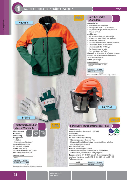 INHALT: Körperschutz1 1 WALDARBEITERSCHUTZ / KÖRPERSCHUTZ 43,15 E/D/E Softshell-Jacke »Sanddorn« Eigenschaften: · Wind- und wasserabweisend · Atmungsaktiv durch 3-Lagen-Laminat · Angenehm zu tragen durch Fleecematerial innen in der Jacke Ausführung: · Alle Reißverschlüsse sind wasserdicht · Reflexpaspel vorne, hinten und am Ärmel · Verstellbarer Ärmelsaum · Zwei seitliche Hüfttaschen mit Reißverschluss · Eine Brusttasche mit Reißverschluss · Eine Innentasche für MP3-Player · Zwei Innentaschen im Futter · Eine Handytasche im Futter Material: 96 % Polyester, 4 % Elastan, 3-LagenLaminat, Einsatz am Saum und Ärmelsaum: 100 % Oxford-Polyester Farbe: grün-orange Lieferbare Größen S (001), M (002), L (003), XL (004) XXL (005) Bestell-Nr. /Stück 10091 (...)* 43,15 (A198) Bitte die Bestell-Nr. um den Größencode (...) ergänzen. 39,70 8,95 Forstschutzhandschuh »Forest Worker 1« Eigenschaften: · Hautweich Ausführung: II KATEGORIE · Doppelnähte · Gefüttert · Hochelastischer Strickbund Material: Rindnarbleder, Rücken aus Schirmseide Stärke: 1,21,3 mm Zulassung/Norm: EN 388, EN 420 Farbe: hellgrau-dunkelgrün Lieferbare Größen 10 (100) Bestell-Nr. /Paar 10112 (...)* 8,95 (A390) Bitte die Bestell-Nr. um den Größencode (...) ergänzen. 142 Alle Preise in ohne MwSt. Forst-Kopfschutzkombination »PRO« Eigenschaften: · Gute Gehörschutzdämmung mit 26 dB SNR Ausführung: · Individuell verstellbar · 4-Punkt-Textilinnenausstattung · Abdichtung zwischen Helm und Visier · Klappbares Gitter ist konturiert zur besten Abdichtung zwischen Visier und Gehörschutzkapsel · Maximale Belüftung · Gehörschutz abklappbar, drehbar Material: Helmschale aus hochwertigem PE-Kunststoff mit UV-Stabilisierung, Gesichtsschutz aus Nylongewebe Zulassung/Norm: 2704FN KWF-geprüft, damit freigegeben für alle staatlichen Forstämter, nach EN 397, EN 352-3, EN 166 und EN 1731 Farbe: leuchtorange Größe Einheitsgröße Bestell-Nr. 10106100* /Stück 39,70 (A690)