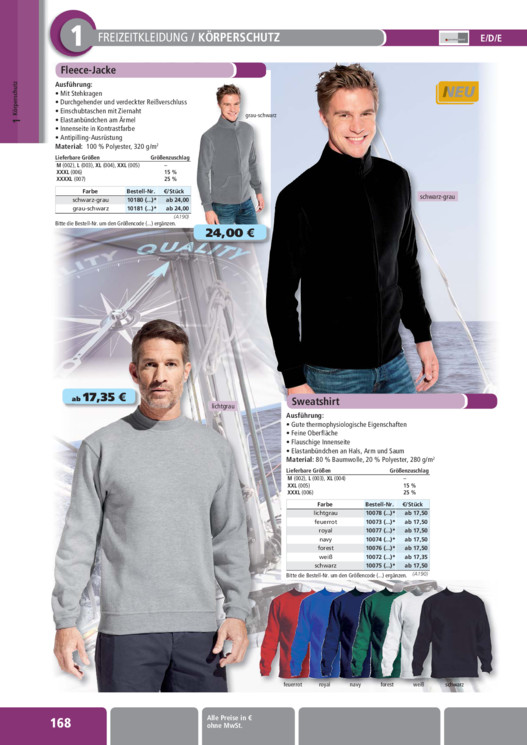 INHALT: Körperschutz1 1 FREIZEITKLEIDUNG / KÖRPERSCHUTZ Fleece-Jacke Ausführung: · Mit Stehkragen · Durchgehender und verdeckter Reißverschluss · Einschubtaschen mit Ziernaht · Elastanbündchen am Ärmel · Innenseite in Kontrastfarbe · Antipilling-Ausrüstung Material: 100 % Polyester, 320 g/m2 Lieferbare Größen M (002), L (003), XL (004), XXL (005) XXXL (006) XXXXL (007) Größenzuschlag 15 % 25 % Farbe Bestell-Nr. /Stück schwarz-grau 10180 (...)* ab 24,00 grau-schwarz 10181 (...)* ab 24,00 (A190) Bitte die Bestell-Nr. um den Größencode (...) ergänzen. grau-schwarz a2b 424,0,000 E/D/E schwarz-grau aabb117,355 lichtgrau Sweatshirt Ausführung: · Gute thermophysiologische Eigenschaften · Feine Oberfläche · Flauschige Innenseite · Elastanbündchen an Hals, Arm und Saum Material: 80 % Baumwolle, 20 % Polyester, 280 g/m2 Lieferbare Größen M (002), L (003), XL (004) XXL (005) XXXL (006) Größenzuschlag 15 % 25 % Farbe Bestell-Nr. /Stück lichtgrau 10078 (...)* ab 17,50 feuerrot 10073 (...)* ab 17,50 royal 10077 (...)* ab 17,50 navy 10074 (...)* ab 17,50 forest 10076 (...)* ab 17,50 weiß 10072 (...)* ab 17,35 schwarz 10075 (...)* ab 17,50 Bitte die Bestell-Nr. um den Größencode (...) ergänzen. (A190) 168 Alle Preise in ohne MwSt. feuerrot royal navy forest weiß schwarz