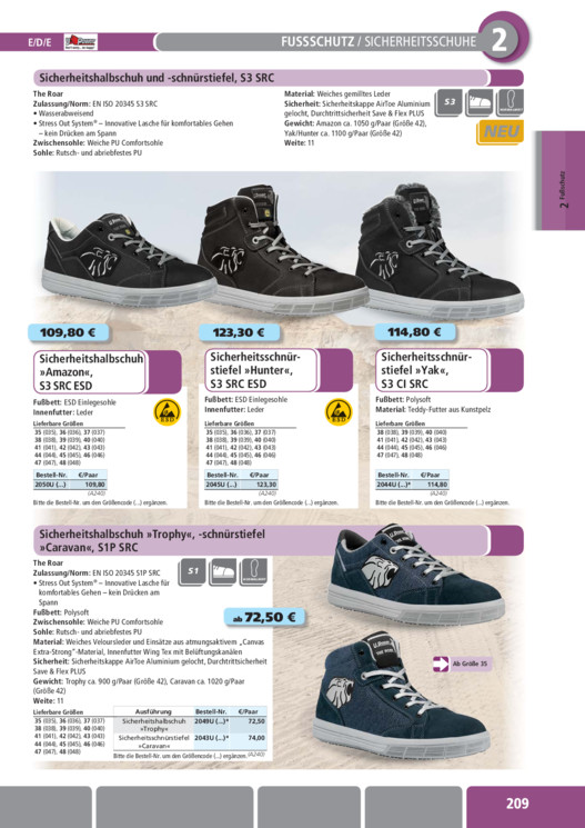 INHALT: 2E/D/E FUSSSCHUTZ / SICHERHEITSSCHUHE Sicherheitshalbschuh und -schnürstiefel, S3 SRC The Roar Zulassung/Norm: EN ISO 20345 S3 SRC · Wasserabweisend · Stress Out System® Innovative Lasche für komfortables Gehen kein Drücken am Spann Zwischensohle: Weiche PU Comfortsohle Sohle: Rutsch- und abriebfestes PU Material: Weiches gemilltes Leder Sicherheit: Sicherheitskappe AirToe Aluminium gelocht, Durchtrittsicherheit Save & Flex PLUS Gewicht: Amazon ca. 1050 g/Paar (Größe 42), Yak/Hunter ca. 1100 g/Paar (Größe 42) Weite: 11 S3 NORMALWEIT Fußschutz2 109,80 Sicherheitshalbschuh »Amazon«, S3 SRC ESD Fußbett: ESD Einlegesohle Innenfutter: Leder Lieferbare Größen 35 (035), 36 (036), 37 (037) 38 (038), 39 (039), 40 (040) 41 (041), 42 (042), 43 (043) 44 (044), 45 (045), 46 (046) 47 (047), 48 (048) Bestell-Nr. /Paar 2050U (...) 109,80 (A240) Bitte die Bestell-Nr. um den Größencode (...) ergänzen. 123,30 Sicherheitsschnürstiefel »Hunter«, S3 SRC ESD Fußbett: ESD Einlegesohle Innenfutter: Leder Lieferbare Größen 35 (035), 36 (036), 37 (037) 38 (038), 39 (039), 40 (040) 41 (041), 42 (042), 43 (043) 44 (044), 45 (045), 46 (046) 47 (047), 48 (048) Bestell-Nr. /Paar 2045U (...) 123,30 (A240) Bitte die Bestell-Nr. um den Größencode (...) ergänzen. Sicherheitshalbschuh »Trophy«, -schnürstiefel »Caravan«, S1P SRC The Roar Zulassung/Norm: EN ISO 20345 S1P SRC · Stress Out System® Innovative Lasche für S1 NORMALWEIT komfortables Gehen kein Drücken am Spann Fußbett: Polysoft Zwischensohle: Weiche PU Comfortsohle aabb772,500 Sohle: Rutsch- und abriebfestes PU Material: Weiches Veloursleder und Einsätze aus atmungsaktivem ,,Canvas Extra-Strong"-Material, Innenfutter Wing Tex mit Belüftungskanälen Sicherheit: Sicherheitskappe AirToe Aluminium gelocht, Durchtrittsicherheit Save & Flex PLUS Gewicht: Trophy ca. 900 g/Paar (Größe 42), Caravan ca. 1020 g/Paar (Größe 42) Weite: 11 Lieferbare Größen 35 (035), 36 (036), 37 (037) 38 (038), 39 (039), 40 (040) 41 (041), 42 (042), 43 (043) 44 (044), 45 (045), 46 (046) 47 (047), 48 (048) Ausführung Bestell-Nr. /Paar Sicherheitshalbschuh 2049U (...)* »Trophy« 72,50 Sicherheitsschnürstiefel 2043U (...)* »Caravan« 74,00 Bitte die Bestell-Nr. um den Größencode (...) ergänzen.(A240) 114,80 Sicherheitsschnürstiefel »Yak«, S3 CI SRC Fußbett: Polysoft Material: Teddy-Futter aus Kunstpelz Lieferbare Größen 38 (038), 39 (039), 40 (040) 41 (041), 42 (042), 43 (043) 44 (044), 45 (045), 46 (046) 47 (047), 48 (048) Bestell-Nr. /Paar 2044U (...)* 114,80 (A240) Bitte die Bestell-Nr. um den Größencode (...) ergänzen. Ab Größe 35 209