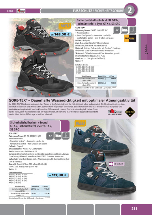 INHALT: Fußschutz2 E/D/E 2FUSSSCHUTZ / SICHERHEITSSCHUHE aabb11443,5500 Sicherheitshalbschuh »LED GTX«, -schnürstiefel »Byte GTX«, S3 SRC GORE-TEX® Zulassung/Norm: EN ISO 20345 S3 SRC S3 · Wasserresistent · Stress Out System® Innovative Lasche für komfortables Gehen kein Drücken am Spann Fußbett: Polysoft Zwischensohle: Weiche PU Comfortsohle Sohle: TPU, mit Shock Absorber aus Gel Material: Weiches Pull-up Leder mit Cordura® Einsätzen, Innenfutter GORE-TEX® Performance Membrane Sicherheit: Sicherheitskappe AirToe Aluminium gelocht, Durchtrittsicherheit Save & Flex PLUS Gewicht: ca. 1200 g/Paar (Größe 42) Weite: 11 Lieferbare Größen 38 (038), 39 (039), 40 (040) 41 (041), 42 (042), 43 (043) 44 (044), 45 (045), 46 (046) 47 (047) Ausführung Bestell-Nr. /Paar Sicherheitshalbschuh 2013U (...) »LED GTX« 143,50 Sicherheitsschnürstiefel 2009U (...) »Byte GTX« 152,30 Bitte die Bestell-Nr. um den Größencode (...) ergänzen.(A240) NORMALWEIT GORE-TEX® Dauerhafte Wasserdichtigkeit mit optimaler Atmungsaktivität Die GORE-TEX® Membrane verhindert, dass Wasser in den Schuh eindringt. Die Füße bleiben trocken und geschützt. Die Membran ist extrem dünn, dauerhaft wasserdicht und atmungsaktiv. Schweiß kann ungehindert entweichen, da die Poren der GORE-TEX® Membrane 700-mal größer sind als ein Wasserdampfmolekül, und so können Ihre Füße dennoch ,,atmen".Durch die mikroskopisch kleinen Poren, welche etwa 20000-mal kleiner sind als ein Wassertropfen, ist die GORE-TEX® Membrane dauerhaft wasserdicht. Ideales Klima für Ihre Füße egal zu welcher Jahreszeit. Sicherheitshalbschuh »Sound GTX«, -schnürstiefel »Surf GTX«, S3 SRC GORE-TEX® Zulassung/Norm: EN ISO 20345 S3 SRC · Wasserresistent S3 NORMALWEIT · Stress Out System® Innovative Lasche für komfortables Gehen kein Drücken am Spann Fußbett: Polysoft Zwischensohle: Weiche PU Comfortsohle Sohle: Rutsch- und abriebfestes PU Material: Weiches Veloursleder und Einsätze aus atmungsaktivem ,,Canvas Extra Strong"-Material, Innenfutter GORE-TEX® Extended Membrane Sicherheit: Sicherheitskappe AirToe Aluminium gelocht, Durchtrittsicherheit Save & Flex PLUS Gewicht: Sound GTX ca. 900 g/Paar (Größe 42), Surf GTX ca. 1020 g/Paar (Größe 42) Weite: 11 Lieferbare Größen 35 (035), 36 (036), 37 (037) 38 (038), 39 (039), 40 (040) 41 (041), 42 (042), 43 (043) 44 (044), 45 (045), 46 (046) 47 (047), 48 (048) aabb11117,3300 Ausführung Bestell-Nr. /Paar Sicherheitshalbschuh 2014U (...) »Sound GTX« 117,30 Sicherheitsschnürstiefel 2010U (...) »Surf GTX« 135,00 Bitte die Bestell-Nr. um den Größencode (...) ergänzen. (A240) Ab Größe 35 211