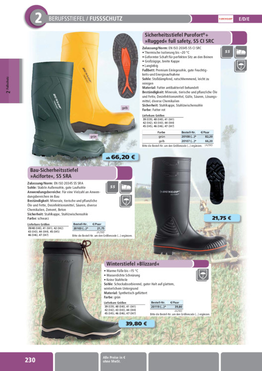 INHALT: Fußschutz2 2 BERUFSSTIEFEL / FUSSSCHUTZ E/D/E Sicherheitsstiefel Purofort®+ »Rugged« full safety, S5 CI SRC Zulassung/Norm: EN ISO 20345 S5 CI SRC · Thermische Isolierung bis 20 °C S5 · Geformter Schaft für perfekten Sitz an den Beinen · Großzügige, breite Kappe · Langlebig Fußbett: Premium Einlegesohle, gute Feuchtig- keits-und Energieaufnahme Sohle: Stoßdämpfend, rutschhemmend, leicht zu reinigen Material: Futter antibakteriell behandelt Beständigkeit: Minerale, tierische und pflanzliche Öle und Fette, Desinfektionsmittel, Gülle, Säuren, Lösungs- mittel, diverse Chemikalien Sicherheit: Stahlkappe, Stahlzwischensohle gelb Farbe: Futter rot Lieferbare Größen 39 (039), 40 (040), 41 (041) 42 (042), 43 (043), 44 (044) 45 (045), 46 (046), 47 (047) grün Farbe Bestell-Nr. /Paar grün 20108 (...)* 82,20 gelb 20107 (...)* 66,20 Bitte die Bestell-Nr. um den Größencode (...) ergänzen. (A290) aabb666,200 Bau-Sicherheitsstiefel »Aciforte«, S5 SRA Zulassung/Norm: EN ISO 20345 S5 SRA Sohle: Stabile Außensohle, gute Laufsohle Anwendungsbereiche: Für eine Vielzahl an Anwendungsbereichen im Bau Beständigkeit: Minerale, tierische und pflanzliche Öle und Fette, Desinfektionsmittel, Säuren, diverse Chemikalien, Zement, Beton Sicherheit: Stahlkappe, Stahlzwischensohle Farbe: schwarz S5 Lieferbare Größen 39/40 (040), 41 (041), 42 (042) 43 (043), 44 (044), 45 (045) 46 (046), 47 (047) Bestell-Nr. /Paar 20103 (...)* 21,75 (A290) Bitte die Bestell-Nr. um den Größencode (...) ergänzen. 21,75 Winterstiefel »Blizzard« · Warme Füße bis 15 °C · Wasserdichte Schnürung · Keine Stahlteile Sohle: Schockabsorbierend, guter Halt auf glattem, winterlichem Untergrund Material: Synthetisch gefüttert Farbe: grün Lieferbare Größen 39 (039), 40 (040), 41 (041) 42 (042), 43 (043), 44 (044) 45 (045), 46 (046), 47 (047) Bestell-Nr. /Paar 20119 (...)* 39,80 (A290) Bitte die Bestell-Nr. um den Größencode (...) ergänzen. 39,80 230 Alle Preise in ohne MwSt.