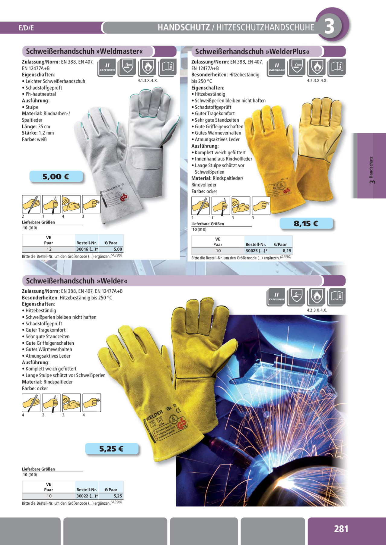 INHALT: Handschutz3 3E/D/E HANDSCHUTZ / HITZESCHUTZHANDSCHUHE Schweißerhandschuh »Weldmaster« Zulassung/Norm: EN 388, EN 407, EN 12477A+B Eigenschaften: · Leichter Schweißerhandschuh · Schadstoffgeprüft · Ph-hautneutral Ausführung: · Stulpe Material: Rindnarben-/ Spaltleder Länge: 35 cm Stärke: 1,2 mm Farbe: weiß II KATEGORIE 4.1.3.X.4.X. 5,00 Schweißerhandschuh »WelderPlus« Zulassung/Norm: EN 388, EN 407, EN 12477A+B Besonderheiten: Hitzebeständig II KATEGORIE bis 250 °C Eigenschaften: · Hitzebeständig · Schweißperlen bleiben nicht haften · Schadstoffgeprüft · Guter Tragekomfort · Sehr gute Standzeiten · Gute Griffeigenschaften · Gutes Wärmeverhalten · Atmungsaktives Leder Ausführung: · Komplett weich gefüttert · Innenhand aus Rindvollleder · Lange Stulpe schützt vor Schweißperlen Material: Rindspaltleder/ Rindvolleder Farbe: ocker 4.2.3.X.4.X. 21 Lieferbare Größen 10 (010) 4 3 VE Paar Bestell-Nr. /Paar 12 30016 (...)* 5,00 Bitte die Bestell-Nr. um den Größencode (...) ergänzen.(A390) Schweißerhandschuh »Welder« Zulassung/Norm: EN 388, EN 407, EN 12477A+B Besonderheiten: Hitzebeständig bis 250 °C Eigenschaften: · Hitzebeständig · Schweißperlen bleiben nicht haften · Schadstoffgeprüft · Guter Tragekomfort · Sehr gute Standzeiten · Gute Griffeigenschaften · Gutes Wärmeverhalten · Atmungsaktives Leder Ausführung: · Komplett weich gefüttert · Lange Stulpe schützt vor Schweißperlen Material: Rindspaltleder Farbe: ocker 21 Lieferbare Größen 10 (010) 3 3 8,15 VE Paar Bestell-Nr. /Paar 10 30023 (...)* 8,15 Bitte die Bestell-Nr. um den Größencode (...) ergänzen.(A390) II KATEGORIE 4.2.3.X.4.X. 4234 5,25 Lieferbare Größen 10 (010) VE Paar Bestell-Nr. /Paar 10 30022 (...)* 5,25 Bitte die Bestell-Nr. um den Größencode (...) ergänzen.(A390) 281