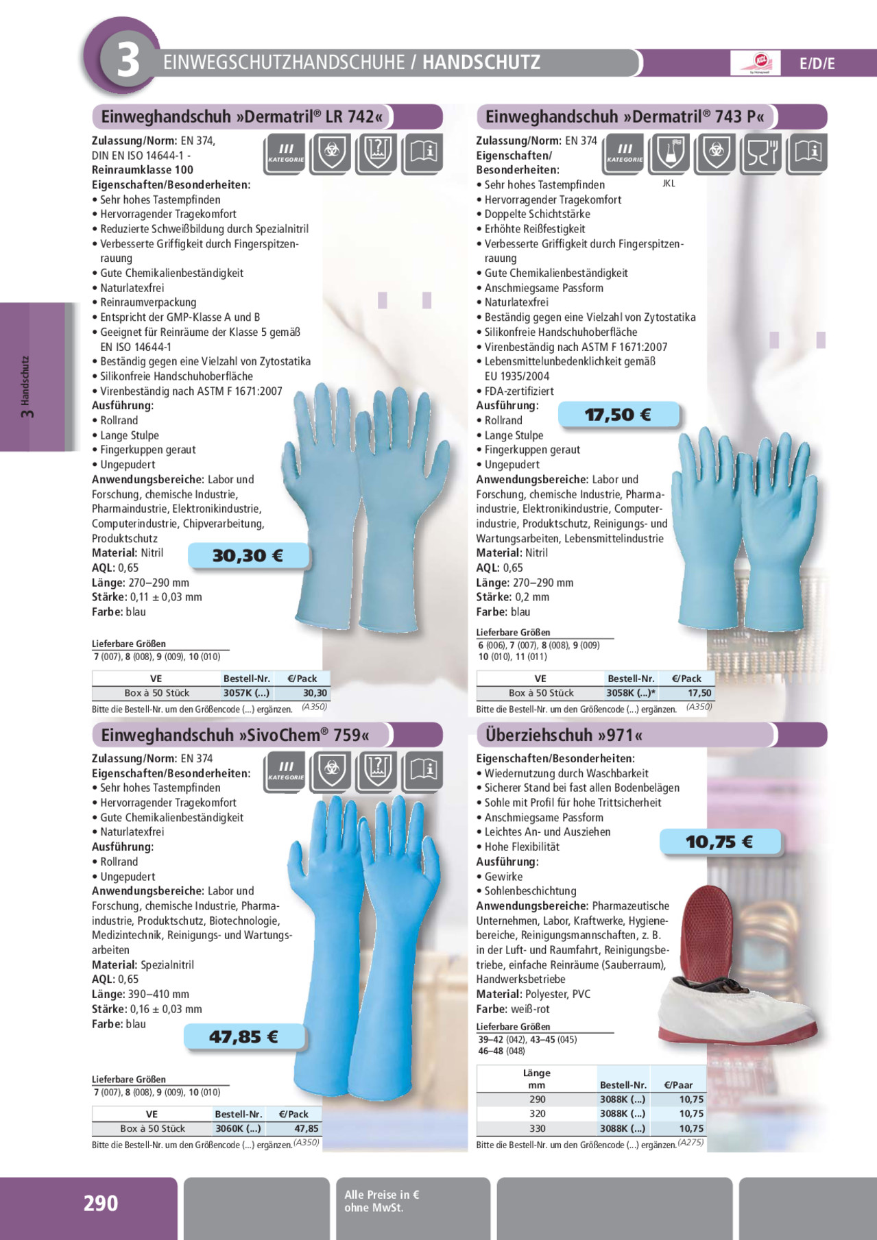 INHALT: Handschutz3 3 EINWEGSCHUTZHANDSCHUHE / HANDSCHUTZ E/D/E Einweghandschuh »Dermatril® LR 742« Zulassung/Norm: EN 374, DIN EN ISO 14644-1 Reinraumklasse 100 III KATEGORIE Eigenschaften/Besonderheiten: · Sehr hohes Tastempfinden · Hervorragender Tragekomfort · Reduzierte Schweißbildung durch Spezialnitril · Verbesserte Griffigkeit durch Fingerspitzen- rauung · Gute Chemikalienbeständigkeit · Naturlatexfrei · Reinraumverpackung · Entspricht der GMP-Klasse A und B · Geeignet für Reinräume der Klasse 5 gemäß EN ISO 14644-1 · Beständig gegen eine Vielzahl von Zytostatika · Silikonfreie Handschuhoberfläche · Virenbeständig nach ASTM F 1671:2007 Ausführung: · Rollrand · Lange Stulpe · Fingerkuppen geraut · Ungepudert Anwendungsbereiche: Labor und Forschung, chemische Industrie, Pharmaindustrie, Elektronikindustrie, Computerindustrie, Chipverarbeitung, Produktschutz Material: Nitril AQL: 0,65 30,30 Länge: 270290 mm Stärke: 0,11 ± 0,03 mm Farbe: blau Lieferbare Größen 7 (007), 8 (008), 9 (009), 10 (010) VE Bestell-Nr. /Pack Box à 50 Stück 3057K (...) 30,30 Bitte die Bestell-Nr. um den Größencode (...) ergänzen. (A350) Einweghandschuh »SivoChem® 759« Zulassung/Norm: EN 374 Eigenschaften/Besonderheiten: · Sehr hohes Tastempfinden III KATEGORIE · Hervorragender Tragekomfort · Gute Chemikalienbeständigkeit · Naturlatexfrei Ausführung: · Rollrand · Ungepudert Anwendungsbereiche: Labor und Forschung, chemische Industrie, Pharma- industrie, Produktschutz, Biotechnologie, Medizintechnik, Reinigungs- und Wartungs- arbeiten Material: Spezialnitril AQL: 0,65 Länge: 390410 mm Stärke: 0,16 ± 0,03 mm Farbe: blau 47,85 Lieferbare Größen 7 (007), 8 (008), 9 (009), 10 (010) VE Bestell-Nr. /Pack Box à 50 Stück 3060K (...) 47,85 Bitte die Bestell-Nr. um den Größencode (...) ergänzen.(A350) Einweghandschuh »Dermatril® 743 P« Zulassung/Norm: EN 374 Eigenschaften/ III KATEGORIE Besonderheiten: · Sehr hohes Tastempfinden JKL · Hervorragender Tragekomfort · Doppelte Schichtstärke · Erhöhte Reißfestigkeit · Verbesserte Griffigkeit durch Fingerspitzen- rauung · Gute Chemikalienbeständigkeit · Anschmiegsame Passform · Naturlatexfrei · Beständig gegen eine Vielzahl von Zytostatika · Silikonfreie Handschuhoberfläche · Virenbeständig nach ASTM F 1671:2007 · Lebensmittelunbedenklichkeit gemäß EU 1935/2004 · FDA-zertifiziert Ausführung: · Rollrand 17,50 · Lange Stulpe · Fingerkuppen geraut · Ungepudert Anwendungsbereiche: Labor und Forschung, chemische Industrie, Pharma- industrie, Elektronikindustrie, Computer- industrie, Produktschutz, Reinigungs- und Wartungsarbeiten, Lebensmittelindustrie Material: Nitril AQL: 0,65 Länge: 270290 mm Stärke: 0,2 mm Farbe: blau Lieferbare Größen 6 (006), 7 (007), 8 (008), 9 (009) 10 (010), 11 (011) VE Bestell-Nr. /Pack Box à 50 Stück 33058K (...)* 17,50 Bitte die Bestell-Nr. um den Größencode (...) ergänzen. (A350) Überziehschuh »971« Eigenschaften/Besonderheiten: · Wiedernutzung durch Waschbarkeit · Sicherer Stand bei fast allen Bodenbelägen · Sohle mit Profil für hohe Trittsicherheit · Anschmiegsame Passform · Leichtes An- und Ausziehen · Hohe Flexibilität 10,75 Ausführung: · Gewirke · Sohlenbeschichtung Anwendungsbereiche: Pharmazeutische Unternehmen, Labor, Kraftwerke, Hygiene- bereiche, Reinigungsmannschaften, z. B. in der Luft- und Raumfahrt, Reinigungsbe- triebe, einfache Reinräume (Sauberraum), Handwerksbetriebe Material: Polyester, PVC Farbe: weiß-rot Lieferbare Größen 3942 (042), 4345 (045) 4648 (048) Länge mm Bestell-Nr. /Paar 290 3088K (...) 10,75 320 3088K (...) 10,75 330 3088K (...) 10,75 Bitte die Bestell-Nr. um den Größencode (...) ergänzen.(A275) 290 Alle Preise in ohne MwSt.