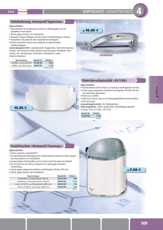 INHALT: Kopfschutz4 E/D/E Helmhalterung »Honeywell Supervizor« Eigenschaften: · Eigenschaften der Kombination variieren in Abhängigkeit von der gewählten Visierscheibe · Schutz gegen Spritzer von Chemikalien · Robuster, strapazierfähiger Gesichtsschutz zur Befestigung an Helmen · Kompatibel mit praktisch allen angebotenen Helmtypen · Bietet maximalen Schutz und ermöglicht uneingeschränkte Kopfbewegungen Anwendungsbereiche: Landwirtschaft, Baugewerbe, chemische Industrie, Energie- oder Stromwirtschaft, Medizin und Pharmazie, Metallbau, Petrochemie, Ver- und Entsorger, Schweißen, Holzindustrie, Labor, Industrie allgemein Beschreibung »SA660«, aus Kunststoff »SA66«, aus Aluminium Bestell-Nr. /Stück 5016H100 14,05 5000H100 17,35 (A440,A520) 4KOPFSCHUTZ / GESICHTSSCHUTZ ab 14,05 aus Aluminium 15,95 Elektrikerschutzschild »SV 9 EK« Eigenschaften: · Acetatscheiben bieten Schutz vor Spritzern und fliegenden Teilchen · Schutz gegen allgemeine Gefahren und fliegende Teilchen (45 m/s) und chemische Substanzen · Passt nur zu SA660 · Maximaler Schutz, ohne in der Bewegungsfreiheit einzuschränken · 200 mm Länge Anwendungsbereiche: Für Elektroarbeiten Zulassung/Norm: 1000 V gemäß VDE, Störlichtbogen getestet (3-polig, 10 kA, 0,5 Sek.), GS-ET-29 Bestell-Nr. 5018H100 /Stück 15,95 (A440) Gesichtsschutz »Honeywell Clearways« Eigenschaften: · Sicher, praktisch, wirtschaftlich · Gut abschließende Befestigung der Scheibe bietet zusätzlichen Schutz gegen das Durchsickern von Chemikalien · Austauschbare Sichtscheiben sind in Acetat oder Polycarbonat erhältlich · Ein Gewicht von nur 160 g ermöglicht eine ganztägige, bequeme Verwendung · Schutz gegen allgemeine Gefahren und fliegende Teilchen (120 m/s) · Schutz gegen Spritzer von Chemikalien Beschreibung Kopfhalter mit Elastikband »CB 14« Kopfhalter mit Drehverschluss »CB 20« Visier »CV 83 P« aus Polycarbonat (200 mm) Visier »CV 84 A« aus Acetat (200 mm) Bestell-Nr. 5021H100* 5020H100 5022H100* 5023H100* /Stück 9,95 13,10 7,50 8,15 (A440) ab 7,50 309