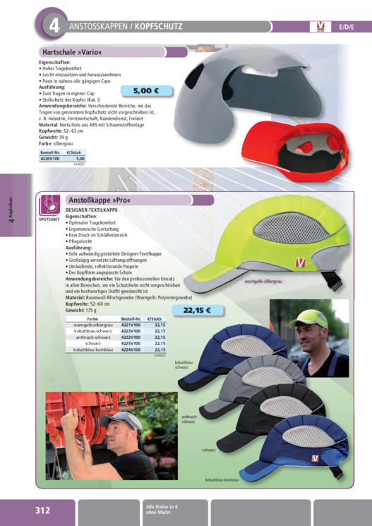 INHALT: Kopfschutz4 4 ANSTOSSKAPPEN / KOPFSCHUTZ Hartschale »Vario« Eigenschaften: · Hoher Tragekomfort · Leicht einzusetzen und herauszunehmen · Passt in nahezu alle gängigen Caps Ausführung: · Zum Tragen in eigener Cap 5,00 · Stoßschutz des Kopfes (Kat. I) Anwendungsbereiche: Verschiedenste Bereiche, wo das Tragen von genormtem Kopfschutz nicht vorgeschrieben ist, z. B. Industrie, Forstwirtschaft, Kundendienst, Freizeit Material: Hartschale aus ABS mit Schaumstoffeinlage Kopfweite: 5263 cm Gewicht: 39 g Farbe: silbergrau Bestell-Nr. 4220V100 /Stück 5,00 (A400) Anstoßkappe »Pro« SPOTLIGHT DESIGNER-TEXTILKAPPE Eigenschaften: · Optimaler Tragekomfort · Ergonomische Gestaltung · Kein Druck im Schläfenbereich · Pflegeleicht Ausführung: · Sehr aufwändig gestaltete Designer-Textilkappe · Großzügig vernetzte Lüftungsöffnungen · Umlaufende, reflektierende Paspeln · Der Kopfform angepasste Schale Anwendungsbereiche: Für den professionellen Einsatz in allen Bereichen, wo ein Schutzhelm nicht vorgeschrieben und ein hochwertiges Outfit gewünscht ist Material: Baumwoll-Mischgewebe (Warngelb: Polyestergewebe) Kopfweite: 5260 cm Gewicht: 175 g 22,15 Farbe warngelb-silbergrau kobaltblau-schwarz anthrazit-schwarz schwarz kobaltblau-kornblau Bestell-Nr. 4221V100 4223V100 4222V100 4225V100 4224V100 /Stück 22,15 22,15 22,15 22,15 22,15 (A400) kobaltblauschwarz warngelb-silbergrau 312 anthrazitschwarz schwarz Alle Preise in ohne MwSt. kobaltblau-kornblau E/D/E