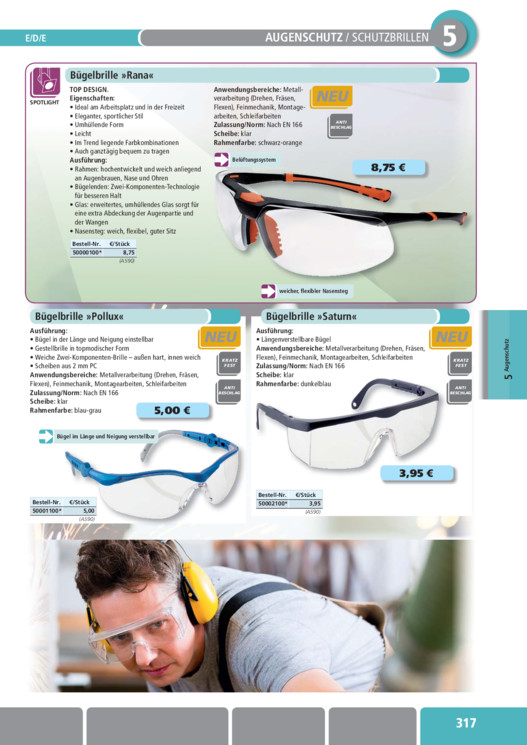 INHALT: 5E/D/E AUGENSCHUTZ / SCHUTZBRILLEN SPOTLIGHT Bügelbrille »Rana« TOP DESIGN. Eigenschaften: · Ideal am Arbeitsplatz und in der Freizeit · Eleganter, sportlicher Stil · Umhüllende Form · Leicht · Im Trend liegende Farbkombinationen · Auch ganztägig bequem zu tragen Ausführung: · Rahmen: hochentwickelt und weich anliegend an Augenbrauen, Nase und Ohren · Bügelenden: Zwei-Komponenten-Technologie für besseren Halt · Glas: erweitertes, umhüllendes Glas sorgt für eine extra Abdeckung der Augenpartie und der Wangen · Nasensteg: weich, flexibel, guter Sitz Bestell-Nr. 50000100* /Stück 8,75 (A590) Anwendungsbereiche: Metallverarbeitung (Drehen, Fräsen, Flexen), Feinmechanik, Montagearbeiten, Schleifarbeiten Zulassung/Norm: Nach EN 166 Scheibe: klar Rahmenfarbe: schwarz-orange Belüftungssystem ANTI BESCHLAG 8,75 weicher, flexibler Nasensteg Bügelbrille »Pollux« Ausführung: · Bügel in der Länge und Neigung einstellbar · Gestellbrille in topmodischer Form · Weiche Zwei-Komponenten-Brille außen hart, innen weich · Scheiben aus 2 mm PC Anwendungsbereiche: Metallverarbeitung (Drehen, Fräsen, Flexen), Feinmechanik, Montagearbeiten, Schleifarbeiten Zulassung/Norm: Nach EN 166 Scheibe: klar Rahmenfarbe: blau-grau 5,00 KRATZ FEST ANTI BESCHLAG Bügelbrille »Saturn« Ausführung: · Längenverstellbare Bügel Anwendungsbereiche: Metallverarbeitung (Drehen, Fräsen, Flexen), Feinmechanik, Montagearbeiten, Schleifarbeiten Zulassung/Norm: Nach EN 166 Scheibe: klar Rahmenfarbe: dunkelblau Bügel im Länge und Neigung verstellbar KRATZ FEST ANTI BESCHLAG Bestell-Nr. 50001100* /Stück 5,00 (A590) Bestell-Nr. 50002100* /Stück 3,95 (A590) 3,95 Augenschutz5 317